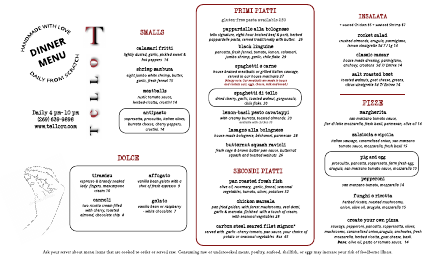 pappardelle alla bolognese tello signature, eight-hour braised beef & pork, herbed pappardelle pasta, served traditionally with butter. 26 black linguine pancetta, fresh fennel, tomato, lemon, calamari, jumbo shrimp, garlic, chile flake 29 spaghetti e carne house braised meatballs or grilled Italian sausage, served in our house marinara 27 (Allergy note: Our meatballs are made in house and contain nuts, eggs, cheese, milk and bread.) spaghetti di tello dried cherry, garlic, toasted walnut, gorgonzola, chile flake. 20 lemon-basil pesto cavatappi with creamy burrata, toasted almonds. 20 available with chicken $5 lasagne alla bolognese house-made bolognese, béchamel, parmesan 28 butternut squash ravioli fresh sage & brown butter pan sauce, butternut squash and toasted walnuts 26 pan roasted fresh fish olive oil, rosemary, garlic, fennel, seasonal vegetables, tomato, olives, potatoes 32 chicken marsala pan fried golden, with forest mushrooms, veal demi, garlic & marsala. finished with a touch of cream, with seasonal vegetables 28 carbon steel seared filet mignon* served with garlic -cherry tomato, pan sauce. your choice of potato or seasonal vegetables 8oz 45