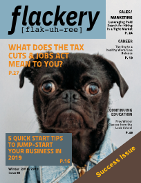 Welcome to the winter issue of Flackery. This quarter the focus is success and we've packed the magazine with expert tips, tricks, and insights to help you succeed in 2019. Jump-start your business with insights from 4 local business experts Create new habits for healthy living Tools to improve your productivity Winter Safety Finding your work/life balance and much more! We've also got a three-page spread spotlighting the work of this issue's featured member, photojournalist Allegra Boverman. Her work is amazing. She's photographed everyone from presidents to breaking news, wildlife, and kids getting a photo op with Santa and somehow manages to find a new story in every shot. We also have a special feature from Ed Carter, CPA highlighting how the Tax Cuts and Jobs Act of 2017 will be affecting your taxes this year. (It's going to be crazy.) As we move into December and January please take a few minutes to rest and recharge. Between bad weather, holidays, and year-end tasks it can be a stressful time of year. Instead of taking a running jump into the new year, think about how you can work smarter instead of harder. And yes, this is something I have to work on too. Best wishes for a happy & healthy new year! Pat Hammond Editor/Publisher Flackery